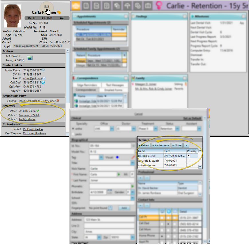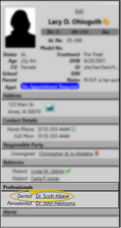 You identify the patient's dentist on the Patient Information Panel. Other professionals, such as endodontists and oral surgeons, are ignored.