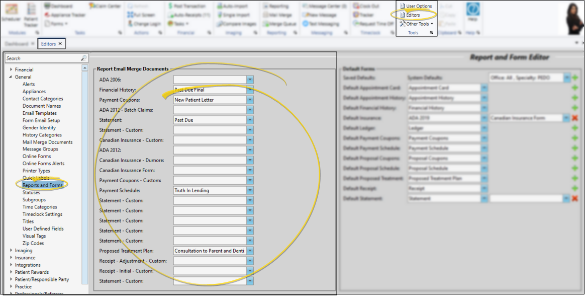 In addition to printing them, you can send most forms to your patients and parents via email. To do this, you must use your Reports and Forms editor to assign a mail merge document to use as the text of the email message. When you email a form, the name of the assigned mail merge document will be the email subject, the text of the mail merge document will be the email message, and the form will be sent as a PDF attachment. In addition, the mail merge document and the form will be entered as separate items in the patient's correspondence history. See "Reports and Forms Editor" for details.