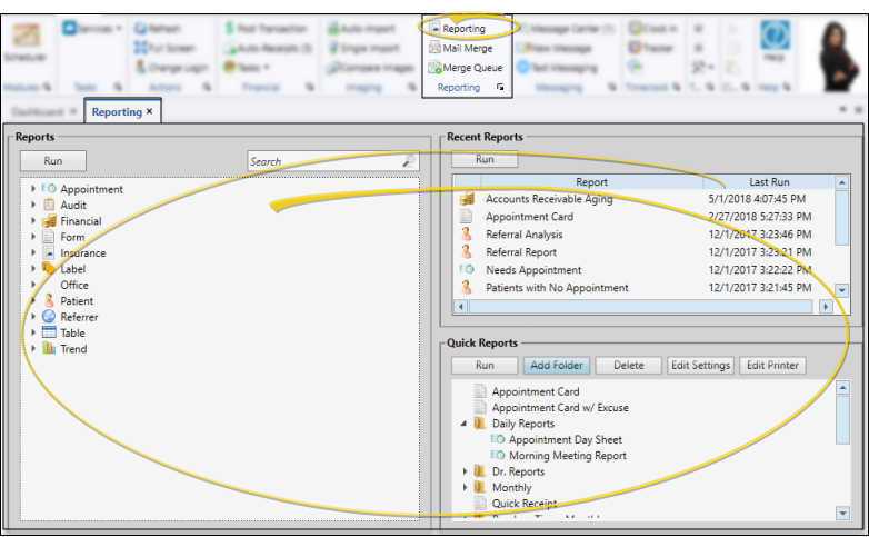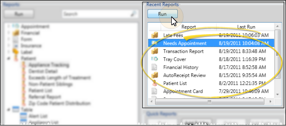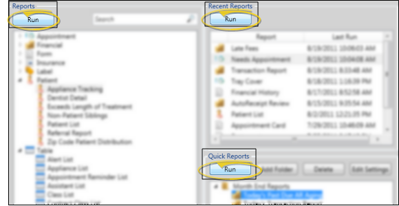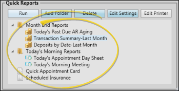 Your Quick Reports are listed on the lower right-side of the window, under your Recent Reports list. The Quick Reports feature provides one-click access to viewing and printing reports with preset report options, from either your Reporting window or the Quick Reports widget. You can run a quick report individually, or run a group of quick reports with one click, saving you time when running your month-end or morning huddle reports. See "Quick Reports" for details about creating and running these reports.