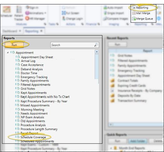 - Home ribbon bar > Reporting section > Reporting > Appointment > Schedule Coverage> Run. (You can also use the Search field to find the report you want to work with.) You might also be able to run this report or form from your Recent Reports or Quick Reports list. See "Run Edge Cloud Reports" for details.