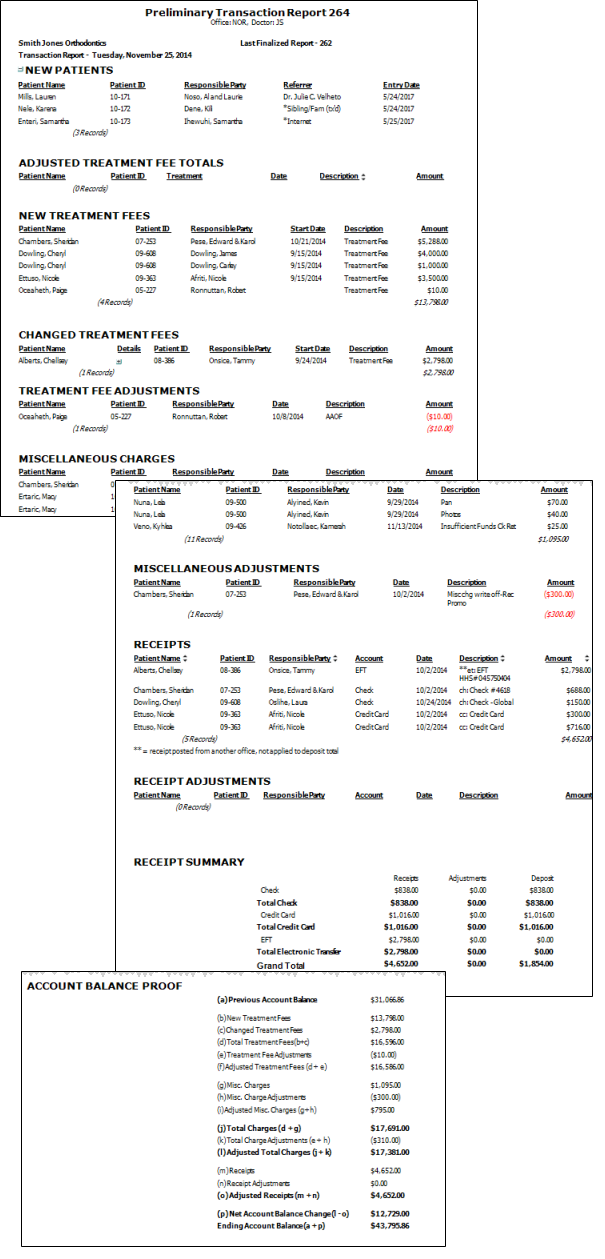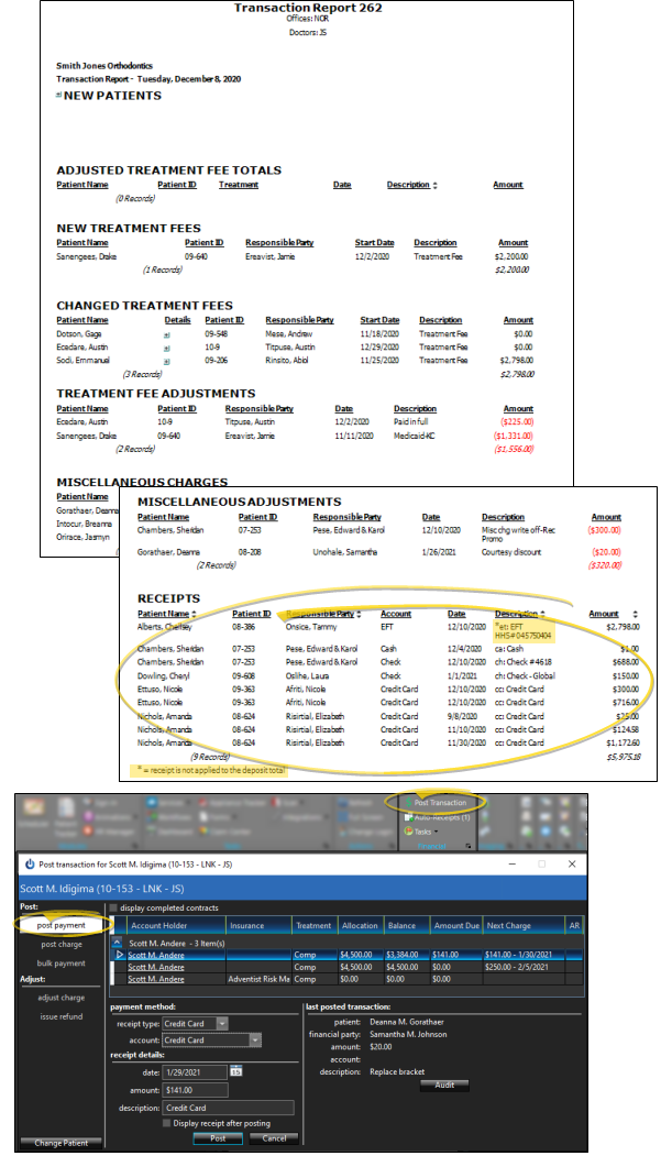 Receipt Adjustments - The Receipt Adjustments section of the Transaction report lists transactions entered as receipt adjustments by right-clicking the receipt in he patient's ledger, as well as refunds applied from the Post Transactions window. These transactions are not included in your deposit total. The transactions are listed alphabetically by patient last name.