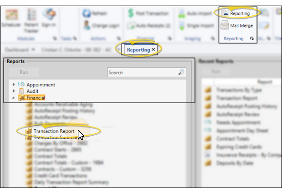 Open the Report - Select Reporting from the Reporting section of the Home ribbon bar. Then from the Financial section, open the Transaction report. You can double-click the report name, or click Run at the top of the window to continue. (You can also use the Search field to find the report you want to work with.) You might also be able to run this report or form from your Recent Reports or Quick Reports list. See "Run Edge Cloud Reports" for details.