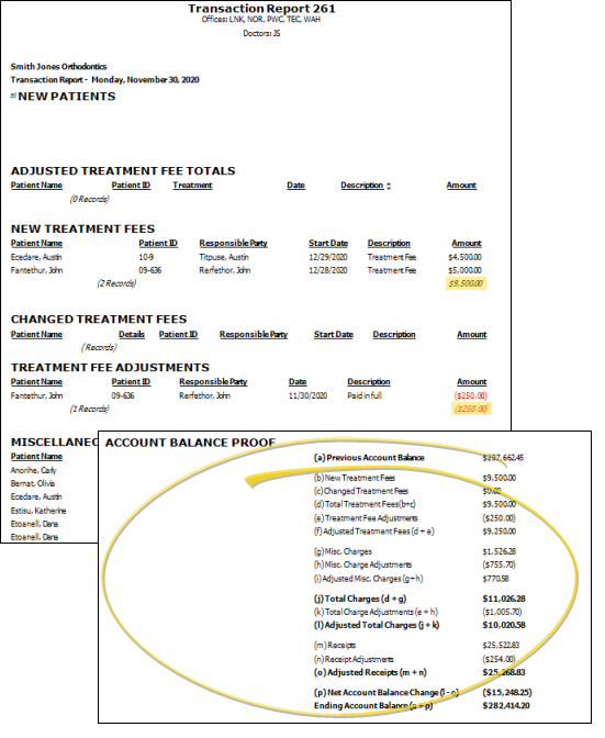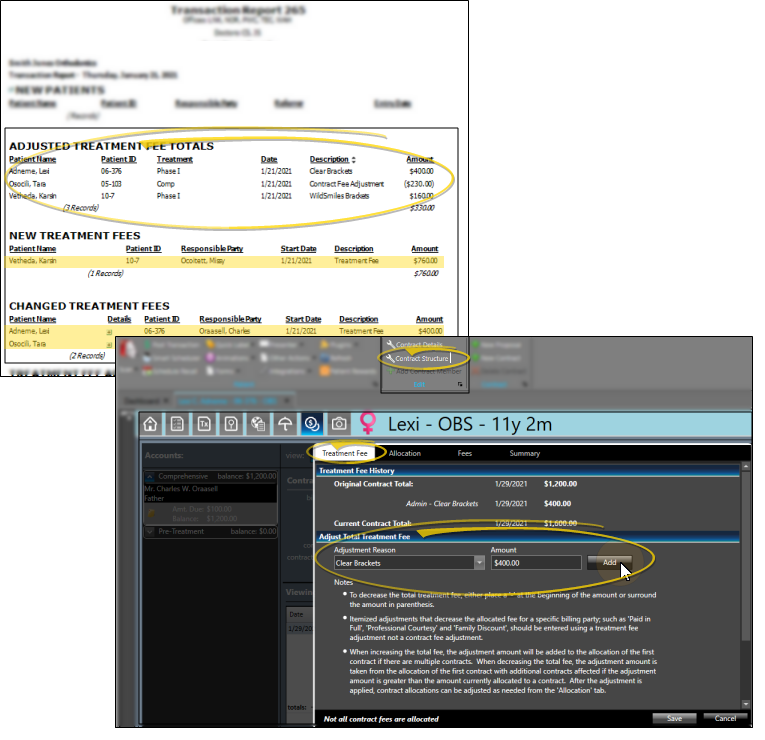 Changed Treatment Fees - This section includes production and non-production adjustments applied to existing orthodontics contracts, as well as contract member allocation changes. The transactions are listed alphabetically by patient last name.