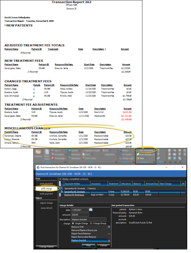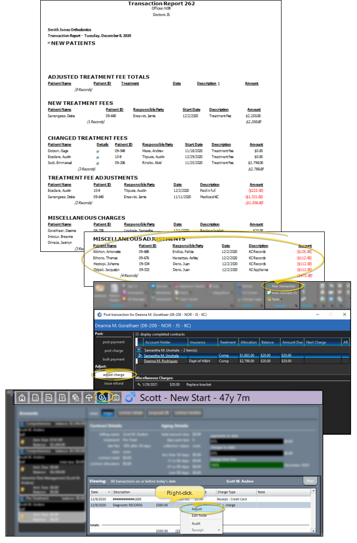 Miscellaneous Adjustments - The Miscellaneous Adjustments section of the Transaction report lists transactions entered as charge adjustments from the Post Transaction window or by right-clicking the miscellaneous charge in the patient's ledger. The transactions are listed alphabetically by patient last name.