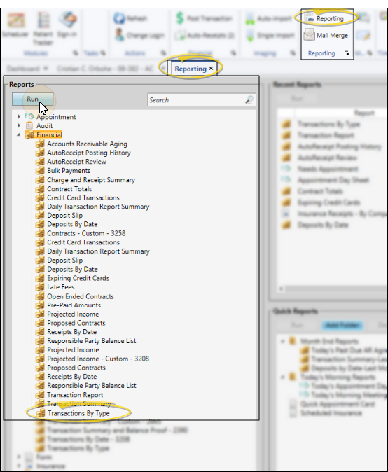 - Home ribbon bar > Reporting section > Reporting > Financial > Transactions by Type > Run. (You can also use the Search field to find the report you want to work with.) You might also be able to run this report from your Recent Reports or Quick Reports list. See "Run Edge Cloud Reports" for details.