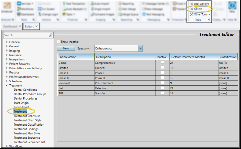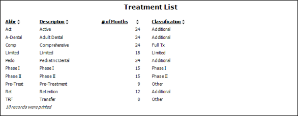 Run a Treatment List report to obtain a list of the active records in your Treatments editor. The report includes the description, abbreviation, default number of treatment months, and the assigned classification, if any, for each treatment. Only active records are included in the report: Any items flagged Inactive in the editor are omitted. If you have Edge Specialist, the records for both orthodontics and pediatric dentistry are included in the report.