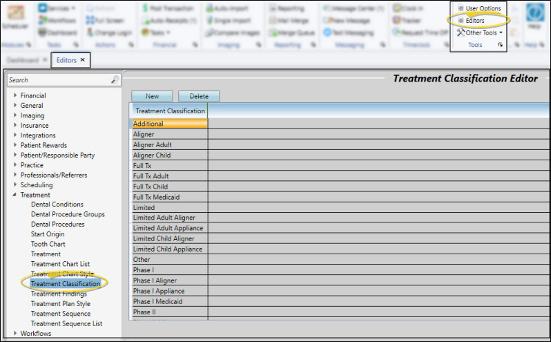 Use the Treatment Classification editor to create a list of categories to assign to your treatment phases (most commonly used with Gaidge integrations). The data is collected according to the phase assigned to your patient folders. You can optionally add standard Gaidge descriptions to this list. See "Treatment Phase Classification Editor" for details.