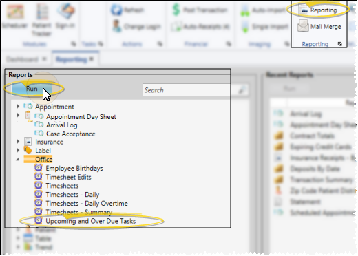 Select Reporting from the Reporting section of the Home ribbon bar. Then from the Office section, open the Upcoming and Over Due Tasks report. You can double-click the report name, or click Run at the top of the window to continue.(You can also use the Search field to find the report you want to work with.) You might also be able to run this report from your Recent Reports or Quick Reports list. See "Run Edge Cloud Reports" for details.