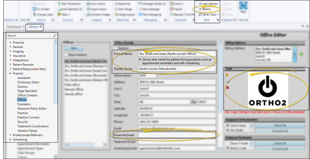 Use your Office editor to set up the office name or alias, logo, and Scheduling Email address to use when prospective patients use Online Scheduling to book appointments with you.