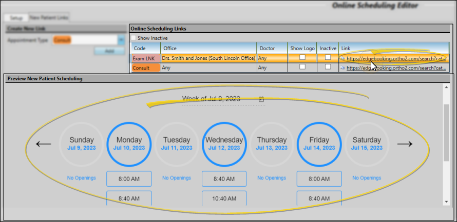 Use the Online Scheduling editor to set up how prospective patients can book appointments from your website. The Setup tab and New Patient Links tab work together to first enable office locations and appointment types for Online Scheduling, then assigning doctors and offices, creating website links, and previewing your scheduling forms. See "Online Scheduling Editor" for details.