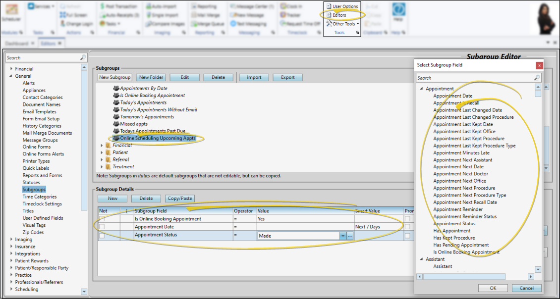 Use your Subgroup editor to create a subgroup that includes the field "Is Online Booking Appointment = Yes". You can use other appointment, pending appointment, and procedure fields to narrow the subgroup, but no other fields will work, since the prospective patient has no other presence in Edge Cloud. For tracking upcoming appointments, we recommend something like this: "Is Online Booking Appointment = Yes", and "Appointment Date" set to either a prompt, date, date range, or smart value as needed, and "Appointment Status = Made". This subgroup would include made appointments created through Online Scheduling.