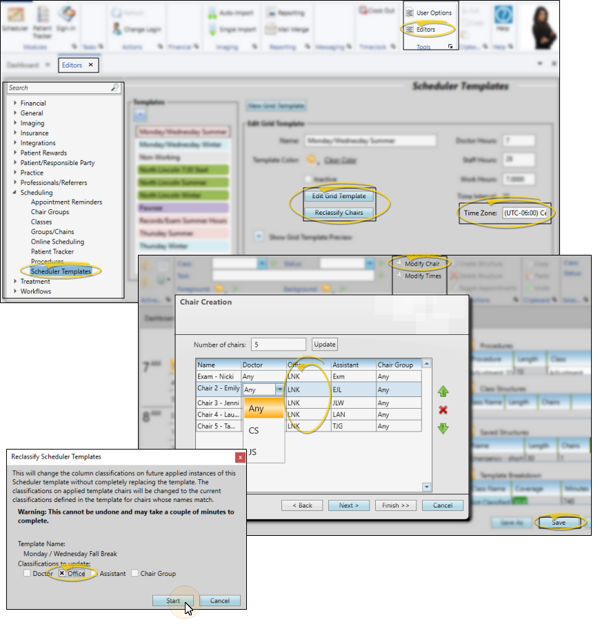Use your Schedule Templates editor to confirm the time zone, and make sure each chair in the template(s) you want to use for Online Scheduling has a specific office assigned to it. Once you have edited your templates, you can use the Reclassify Chairs feature to update future uses of those templates to your new chair/office settings.