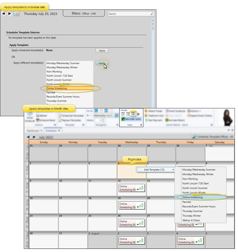 Online Scheduling will only work for dates that have templates specifically applied to them. So, even if you correctly set up your Scheduler templates, Online Scheduling cannot use them unless they are applied to specific dates. To do this, you can either go to each date you wish to use with Online Scheduling and apply the appropriate template(s), or use Month View mode to easily apply templates to dates in the future.