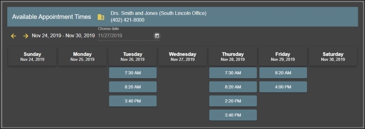 Prospective patients can go to your web site and click your Online Scheduling link, or use the link you copied from your Online Scheduling editor and emailed to them, to open a window with available appointment slots. If you have multiple office locations, and didn't assign an office when creating the link, the prospect will be asked which office they are scheduling with before they can select a time.