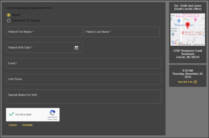 After an appointment date and time are selected, the prospective patient fills out a brief form, and the appointment will be added to your Edge Cloud Scheduler. Prospects have five minutes to complete the form, or add additional time to do so. Prospects will receive an email confirming their appointment after the form is completed.
