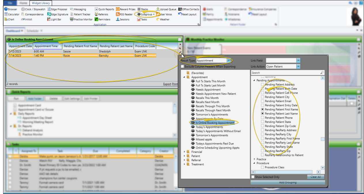 Open the Subgroup widget as either a dashboard or application widget, and choose to view your online scheduling subgroup. In the widget settings, the Result Type MUST be "Appointment", since the prospective patient has no other presence in Edge Cloud; Also, you can only use the Appointment, Pending Appointment, and Procedure categories when choosing what to display in the widget. We recommend including Pending Patient First Name, Pending Patient Last Name, Appointment Date, Appointment Time, and Procedure Code (if desired).