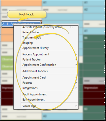 • You can right-click an appointment in your Scheduler to perform several tasks for that patient, regardless of who the "active" patient is currently.