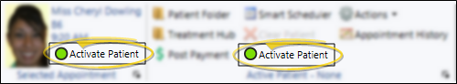 To activate a patient, click an appointment, then click Activate Patient in the Selected Appointment section or Active Patient section of your Scheduler ribbon bar. Or, click an appointment in your scheduling grid and press F2 on your keyboard, or right-click an appointment and select Activate.