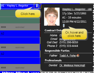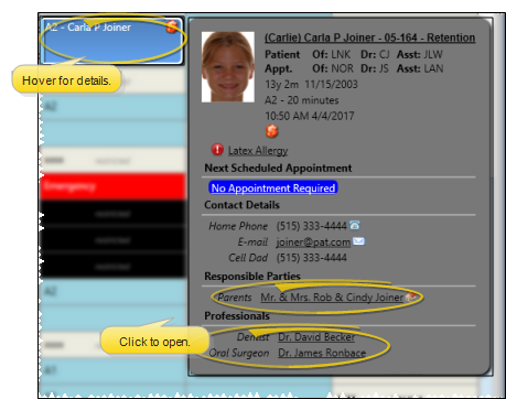 Some of the details displayed in the tooltip include the patient name, age, ID number, office, doctor, and assistant assignments, medical alerts, and contact information. If the patient has a nickname, it appears in parentheses before the patient full name, at the top of the hover window. Also, if the office, doctor, or assistant assigned to the appointment is different than that assigned to the patient folder, both sets of information will be displayed.