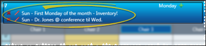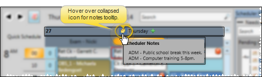 • Use the Scheduler Notes feture to add, edit, and delete notes about your schedule. The notes appear under the day of the week header at the top of your schedule. You can choose to show the notes at all times, or collapse them into a tooltip. In addition, you can use the Search tool at the top of your Scheduler window to search for both appointment data and note text for the currently visible grid.See "Scheduler Notes" for details.