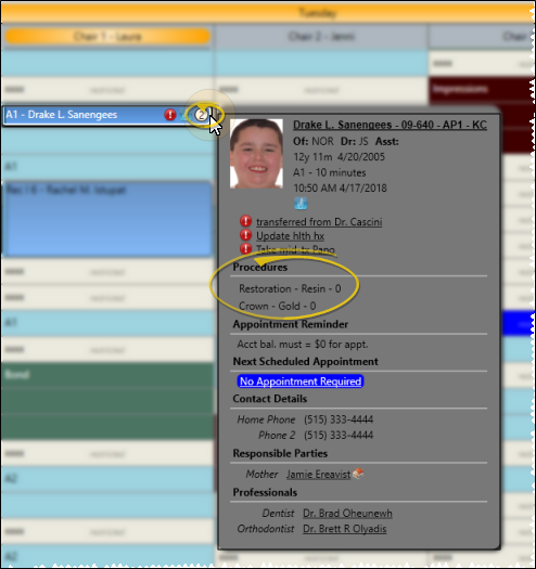 Number of Dental Procedures - You can choose to show / hide the number of dental procedures (i.e. "" that are associated with a scheduled appointment. When this option is enabled, you can hover over the number to open the patient information pop-up window, where you can see the procedure descriptions. (See "Appointment Options" for details about enabling / disabling this option.)