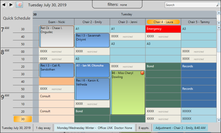 Drag & Drop Appointments - You can quickly reschedule an appointment by dragging and dropping the appointment to a new time slot that has enough cells available to accommodate the procedure.See "Drag and Drop Appointments" for details.