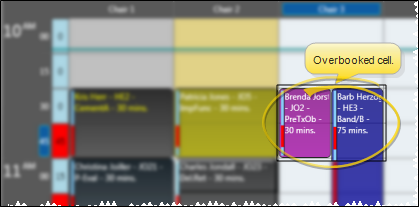 • When multiple appointments are scheduled for the same cell, each appointment is narrowed to fit the column width.