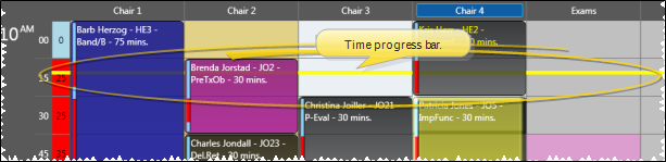 - (Optional.)The time progress bar overlays a horizontal stripe (or bar) across your scheduling grid to indicate the current time on today's schedule. This lets you see at a glance who is running late and who will be coming in soon. The bar can be enabled/disabled, and its width, opacity, and color can all be edited in the Time Progress Bar tab of your Scheduler user options. (See "Time Progress Bar Options" for details.) To consider yourself "on time", appointments that appear above the bar should be completed. You are "ahead of schedule" when appointments below the bar have already been completed.