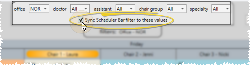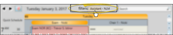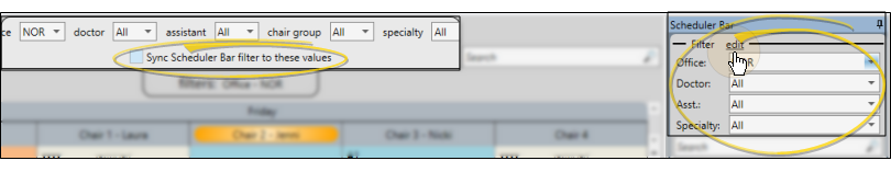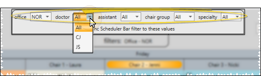 • Click Filters, then choose to see only appointments for a certain office, doctor, assistant, or chair group. Or choose to view all appointments. The filters bar indicates which filters are active, if any. When a filter is active, you will see the scheduled appointments that match the filter, and un-scheduled cells that are assigned to your selected filter. You can choose to sync your Scheduler bar with the selected filter(s), or choose different filters for the bar. However, your Quick Scheduler will use the Scheduler filters when displaying results.