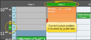 - (Optional.)As you move your cursor around the appointment cells, the Scheduler can highlight your current row and column position along the edges of your schedule, helping you pinpoint your cursor location. (You can enable / disable this feature with your Grid Visuals Options.)
