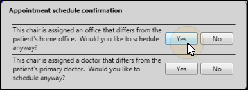 Doctor, Office, Assistant Conflicts - If this appointment is being scheduled to a grid cell that is assigned to a different doctor, office, or assistant than those in the patient folder, you must confirm you action before continuing.