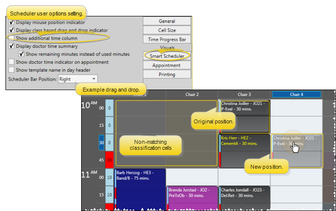 Enable the Use Class Based Drag and Drop Indicator option of your Scheduler user options to highlight the grid cells that match the procedure classification of the appointment you are dragging to a new location. Grid cells that do not match the procedure's classification will be dimmed. If you disable the setting, no cells will appear dimmed when you drag and drop appointments. See "Scheduler Visuals Options" for details.