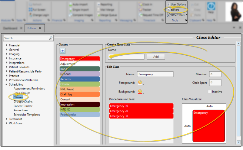 Select a class to work with, then enter a class name, colors, and other details. If you just created a new record, it is selected automatically. The list of appointment type / procedures already assigned to the selected class, and what the class will look like when it is applied to a Scheduler template appear for your review. If you have Edge Specialist, the same list of classes can be applied to the Scheduler templates and appointment type / procedures for all specialties.