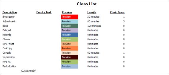 Run the Class List report to obtain a list of the active records in your Class editor that you can use to categorize your appointment procedures and scheduling templates. The report includes the class description and assigned colors, so it is best to print the report with a color printer. The Length and Chair Span fields, if any, indicate the Class Structure that you have created from the class that you can drag and drop onto your scheduling templates. (The Empty Text field is blank: It is for future development.). Only active records are included in the report: Any items flagged Inactive in the editor are omitted. See "Scheduling Class List" for details.
