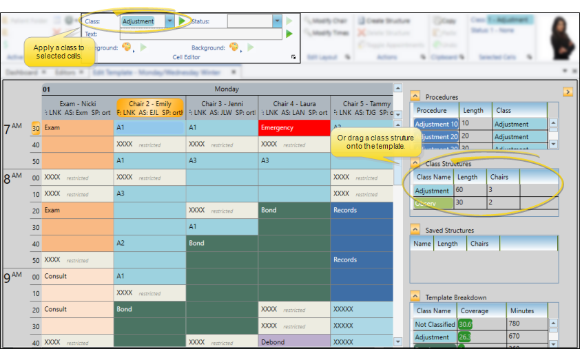 Use the Grid Template Editor to apply classes and class structures (created by assigning a Length and Chair Span to the class) to your scheduling templates. See "Grid Template Editor" for details.