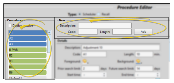 - You can use the New section of the window to create a new appointment type / procedure, or use the list at the left to select an existing appointment type / procedure to work with.