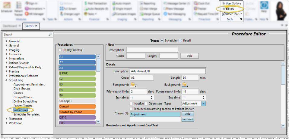 • Select Editors from the Tools section of the Home ribbon bar. Then, from the Scheduling section, open the Appointment Type / Procedure editor. (You can also use the Search field to look for the editor you want to work with.)