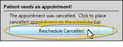 - When you process an appointment as Canceled for a patient whose status requires an appointment, and who has other appointments scheduled, you can click Reschedule Canceled to place the patient, along with the existing details of the missed appointment, on the Pending section of your Needs Appointment list. Or, click the X at the top of the rescheduling box to ignore the message. Whichever action you choose, the original canceled appointment will be recorded in the patient's Appointment History.
