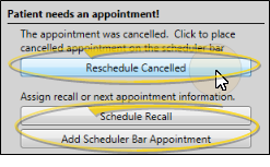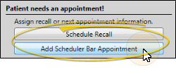 - When you process an appointment as Changed for a patient who has no other appointment scheduled, whether or not the patient's status requires an appointment, you have the opportunity to schedule a recall appointment for the patient, or set up a Scheduler Bar appointment, which adds the patient to the Pending section of your Needs Appointment list.