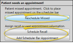 Rescheduling Options - When you process an appointment as Kept for a patient who has no other appointment scheduled, and whose status requires an appointment, you have the opportunity to schedule a recall appointment for the patient, or set up a Scheduler Bar appointment, which adds the patient to the Pending section of your Needs Appointment list.