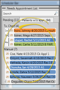 The Needs Appointment section of your scheduler bar lists patients that should have a next appointment scheduled, but don't. You can place patients on the list manually, or automatically track patients that need appointments by enabling the appointment required option for certain status descriptions, and entering treatment chart records that include next appointment criteria. Patients are placed in different sections of your Needs Appointment list depending upon how they were added to the list, and the available details of the next needed appointment. See "Needs Appointment List" for details.