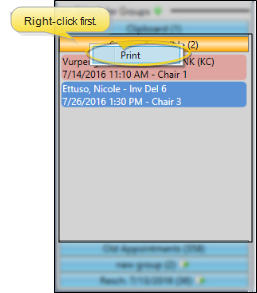Right-click the scheduler bar heading, or right-click a blank space within the scheduler bar panel to print the contents of that list. (You cannot print the Needs Appointment list in this way: Instead, print the Needs Appointment report. (See "Needs Appointment Report" for details.)