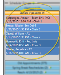 Click the Sooner if Possible scheduler bar heading to open your Sooner if Possible list. As you schedule a patient appointment, you can enable the Sooner If Possible option to place the patient on your Sooner if Possible list, making it easier for you to fill appointment slots that become open due to cancellations. You can activate patients, open patient folders, review and edit appointment details, and remove patients from the Sooner if Possible list directly from this board.