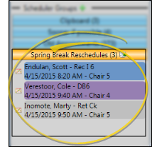 Click the Clipboard scheduler group heading to open your appointment clipboard. You can use the clipboard to temporarily store appointments that you need to reschedule. You can add and reschedule patients from this board as needed, as well as activate patients, open patient folders, and review and edit appointment details.