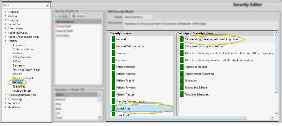 Security Setup - Your Edge Cloud security settings can allow or prevent operators from editing and deleting scheduler notes. To set up this security access, open the Security editor and choose the security model to work with. Then click the Scheduling security group, and set the Allow Editing / Deleting of Scheduling Notes option to the appropriate access setting. (See "Security Editor" for details about using the editor.)