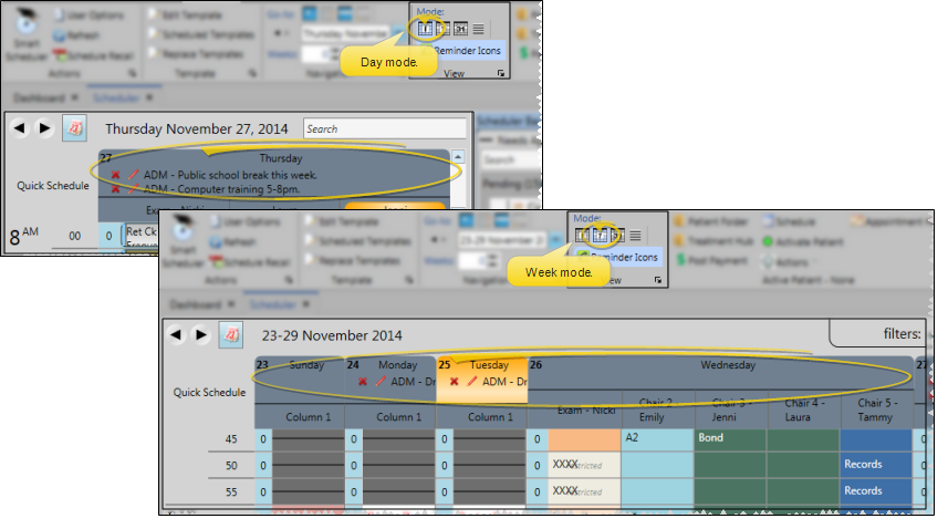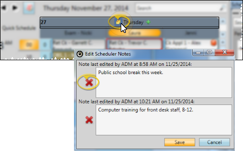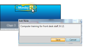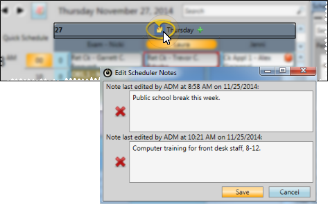 Use the Scheduler Notes feture to add, edit, and delete notes about your schedule. The notes appear under the day of the week header at the top of your schedule. You can choose to show the notes at all times, or collapse them into a tooltip. In addition, you can use the Search tool at the top of your Scheduler window to search for both appointment data and note text for the currently visible grid.