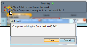 (Available only from Day and Week viewing modes.) Click Edit beside an expanded note you want to work with, or click the Note icon to open the collapsed notes window, then make your changes. Click Save at the bottom of the editing window to save the note and exit.
