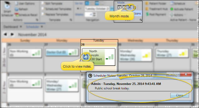 View Notes in Month Mode - Click the Notes icon on your monthly schedule to see any notes that have been created for that day. You cannot add or edit notes from month-view mode. If you don't see a Notes icon, there are no notes available for that date. See "View Monthly Schedule" for details.