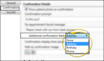 • You can display an additional field of information in the list of matching names that appears after the patient types his or her name into the Patient Sign-In prompt. Select Address, Birthday, Phone number, or None. This setting helps avoid the confusion that could result from multiple patients with identical or similar names.