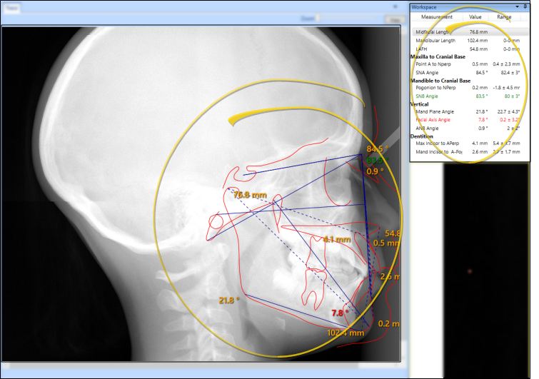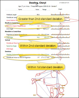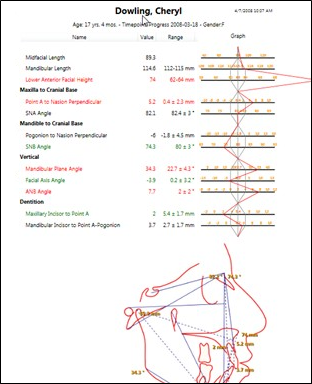 - Click Save in the SmartCeph Main or File ribbon bar, or your Quick Access toolbar, to save a copy of the report in the appropriate timepoint of the patient folder. You can then view the report from the Index layout, or from any layout that includes the Analysis Report image type.